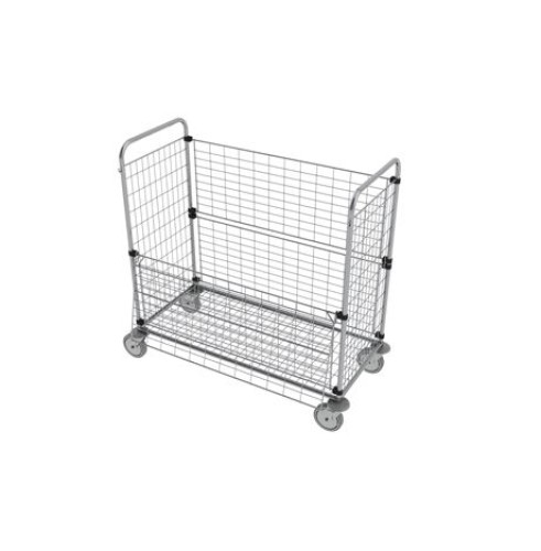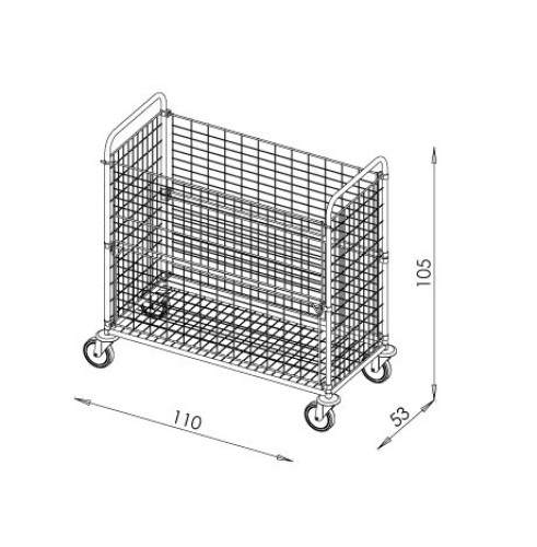 Kovová klietka na kolieskach s chrómovou povrchovou úpravou. Funkcie: 1 x sklopná horná bočnica. Vozík je vybavený 4 x otočným kolesom priemeru 125 mm s plastovými nárazníkmi. Celková nosnosť výrobku je 150 kg. Vozík je možné vybaviť obalmi a vakmi.