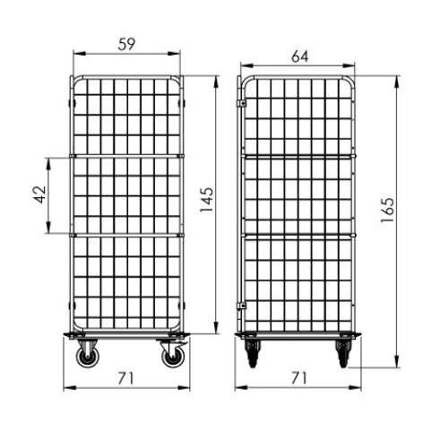Kovová klietka na kolieskach s pozinkovanou povrchovou úpravou. Vozík je vybavený: 2 x prestaviteľná polica, nosnosť 100 kg. Výplň podvozku je pozinkovaný plech. Kolesá: 2x pevné, 2 x otočné s brzdou, priemer 125 mm, vybavené plastovými nárazníkmi. Celková nosnosť výrobku je 350 kg. Vozík je možné vybaviť obalmi a vakmi.
