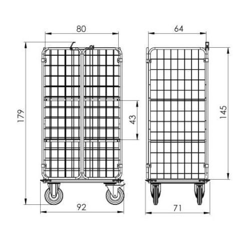 Kovová klietka na kolieskach s pozinkovanou povrchovou úpravou. Vozík je vybavený: 1 x dvere na jednej strane, 2 x prestaviteľná polica, nosnosť 100 kg. Výplň podvozku je pozinkovaný plech. Kolesá: 2x pevné, 2 x otočné s brzdou, priemer 200 mm, vybavené plastovými nárazníkmi. Celková nosnosť výrobku je 400 kg. Vozík je možné vybaviť obalmi a vakmi.