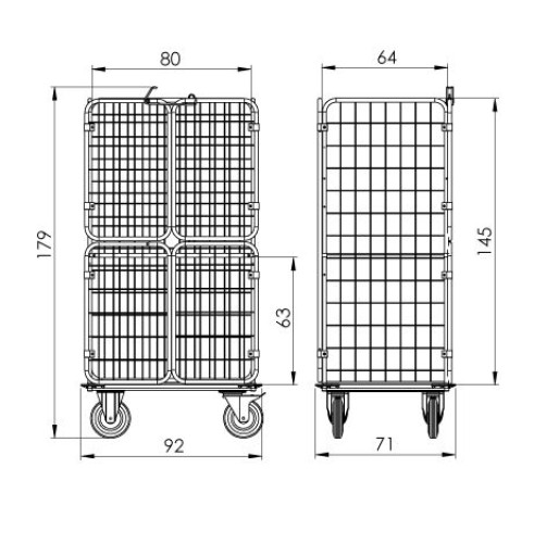Kovová klietka na kolieskach s pozinkovanou povrchovou úpravou. Vozík je vybavený: 1 x dvere na jednej strane, 1 x prestaviteľná polica, nosnosť 100 kg. Výplň podvozku je pozinkovaný plech. Kolesá: 2x pevné, 2 x otočné s brzdou, priemer 200 mm, vybavené plastovými nárazníkmi. Celková nosnosť výrobku je 400 kg. Vozík je možné vybaviť obalmi a vakmi.