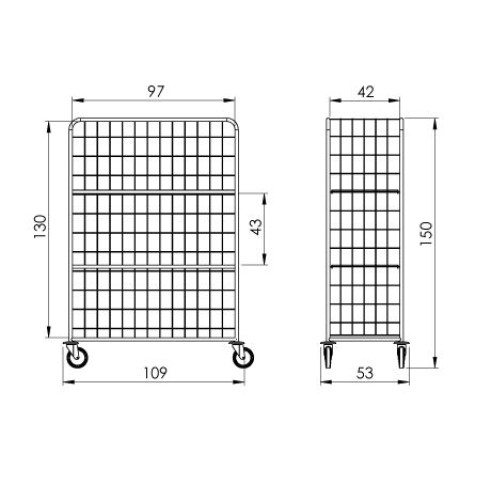 Kovová klietka na kolieskach s pozinkovanou povrchovou úpravou. Vozík je vybavený: 2 x prestaviteľná polica, nosnosť 70 kg. Kolesá sú otočné, priemer 125 mm, vybavené plastovými nárazníkmi. Celková nosnosť výrobku je 300 kg. Vozík je možné vybaviť obalmi a vakmi.