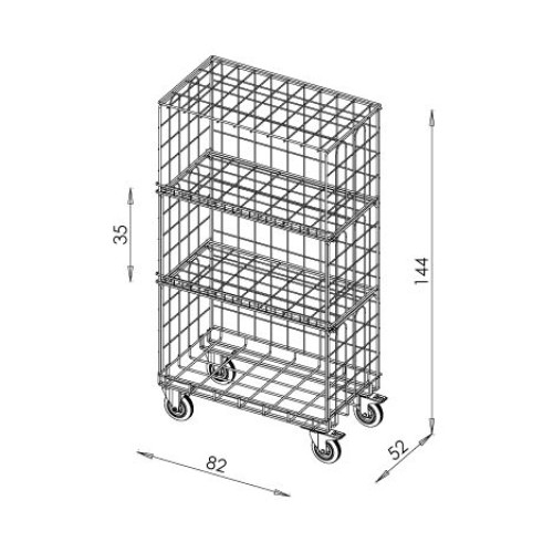 Kovová klietka na kolieskach s horganyzott povrchovou úpravou. Vozík je vybavený: 2 x prestaviteľná polica, nosnosť 50 kg. Kolesá: 2 x pevné, 2 x otočné s brzdou, priemer 125 mm, vybavené plastovými nárazníkmi. Celková nosnosť výrobku je 200 kg. Vozík je možné vybaviť obalmi a vakmi.