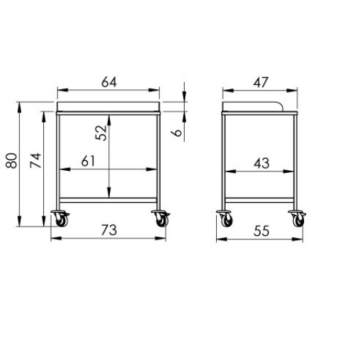 Transportný vozík z nehrdzavejúcej ocele AISI304. Horná úložná plocha vozíka je s odnímateľným ohraničením. Spodná plocha je rovná. Obe majú nosnosť 40 kg a antirezonančnú výstuhu. Celková nosnosť vozíka je 80 kg. Kolesá sú plastové a sú vybavené nárazníkmi. Priemer kolies je 75 mm, z toho 2 sú brzdené.