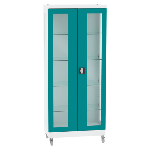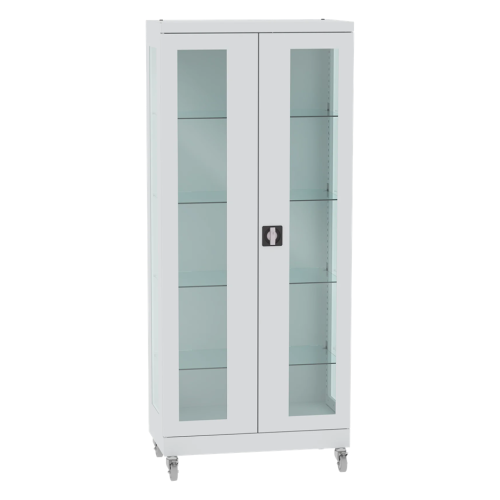 Kovová lieková skriňa šírky 800 mm na kolieskach. Skriňa so sklenenými dverami a policami je optimálnou voľbou pre lekárske ordinácie a iné zdravotnícke zariadenia. Obsah skrinky je chránený dvierkami vybaveným zámkom s dvoma kľúčmi v balení. Sklenené police s hrúbkou 4 mm sú nastaviteľné v po 25 mm (nosnosť 25 kg/polica), vďaka čomu majú skrinky všestranné využitie. Krídlové dvere sú vyplnené tvrdeným sklom s hrúbkou 4 mm. Nábytok je zváraný a nemusí sa skladať, čo mu dodáva pevnosť a stabilitu. Skrinky Sml sa vyznačujú nadčasovým dizajnom a zároveň zabezpečujú bezpečnosť uložených predmetov.