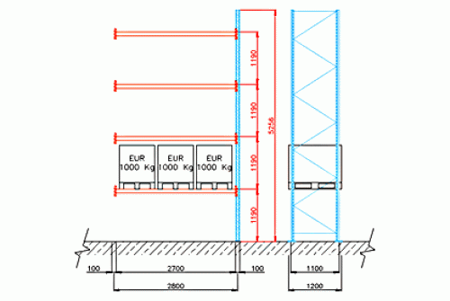 Prídavný regál s max. nosnosťou jednej palety 1000 kg. Dodáva sa vrátane kotviaceho materiálu, pätiek, a podložiek pod stojky. Konštrukcia je z pozinkovanej ocele. Stĺpy sú modrej farby, RAL 5010. Nosníky sú oranžovej farby, RAL 2004. Počet úrovní: zem + 4 úrovne. Police sú nastaviteľné po 70 mm.