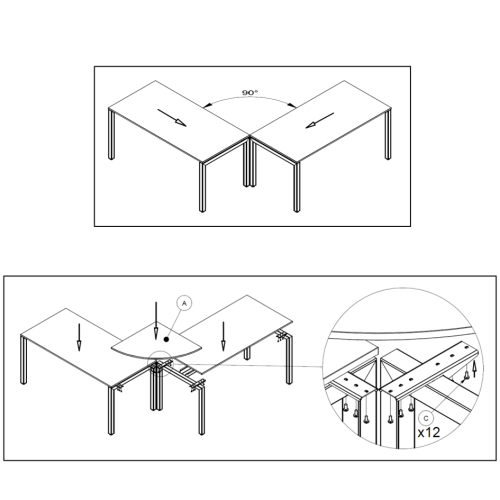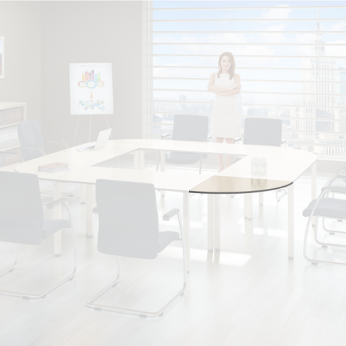 Možnosť rozšíriť kancelársky stôl o dosku v tvare štvrťkruhu a spájať jednotlivé stoly. Výška 745 až 770 mm.