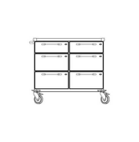 Konštrukcia vozíka môže byť oceľová, ošetrená šedou antimikrobiálnou farbou alebo v nehrdzavejúcom AISI304 prevedení. Vozík má antivibračnú výstuhu. Pracovná plocha vozíka z nehrdzavejúcej ocele AISI304 s jemným prelisom, ochrannými rohmi a nosnosťou 20 kg. Čelá zásuviek sú z kompaktného plastu (ABS), farba je voliteľná zo vzorkovníka. Zásuvky sú určené na skladovanie MS košov. MS koše sú v dvoch veľkostiach: STANDARD a MINI, obe sa dajú rozdeliť priečkami. Nosnosť štandardnej zásuvky je 20 kg a nosnosť mini zásuvky je 10 kg. Zásuvky sú vybavené guličkovým plnovýsuvom, s doťahovaním a dotlmením. Zásuvky sú centrálne uzamykateľné. Produkt je vybavený: 2 x ¾ zásuvka veľkosti M (výška 120 mm), 4 x ¾ zásuvka veľkosti L (výška 200 mm). Vozík je vybavený aj oceľovým madlom, AISI304. Kolesá vozíka sú plastové, s plastovými nárazníkmi. Priemer kolies je 125 mm, z toho 2 s brzdou. Celková nosnosť výrobku je 150 kg.