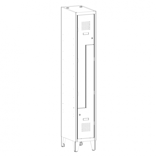 Kovový šatník s dvermi tvaru Z šírky 300 mm s nožičkami. Vnútorné vybavenie zahŕňa tyč s dvoma háčikmi na zavesenie oblečenia a menovku.