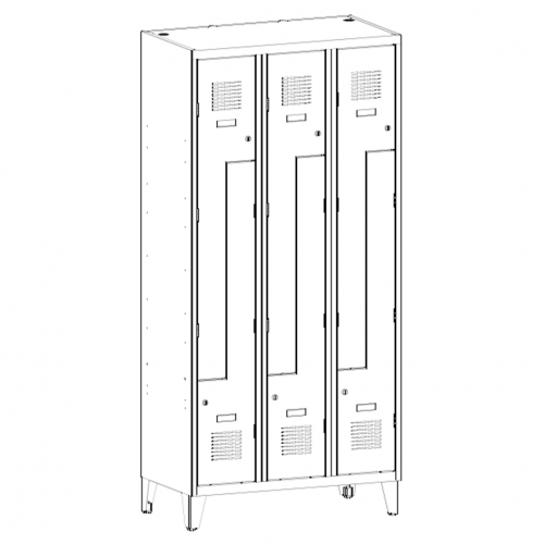 Kovová šatňová skriňa s dverami tvaru Z na nohách.