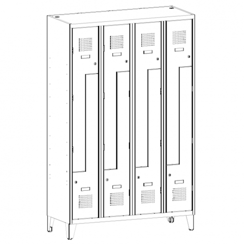 Kovová šatňová skriňa s dverami tvaru Z na nohách.