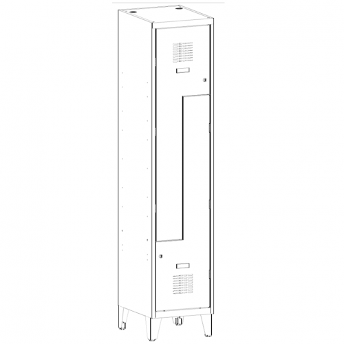 Kovová šatňová skriňa s dverami tvaru Z na nohách.