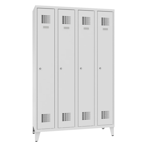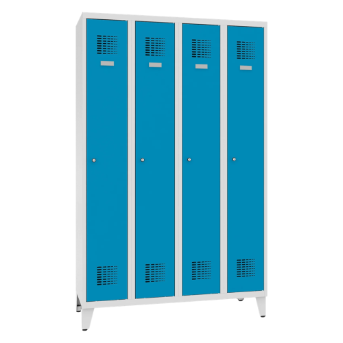Štandardný kovový šatník šírky 1200 mm s nožičkami. Skriňa je uzamykateľná a dodáva sa s 2 kľúčmi pre každé dvere. Vnútorné vybavenie zahŕňa policu v hornej časti oddelenia, tyč s dvoma háčikmi na zavesenie oblečenia, samolepiace zrkadlo, menovku a háčik.