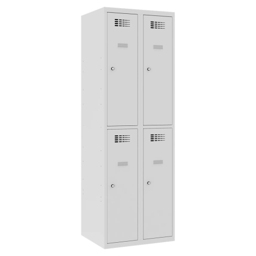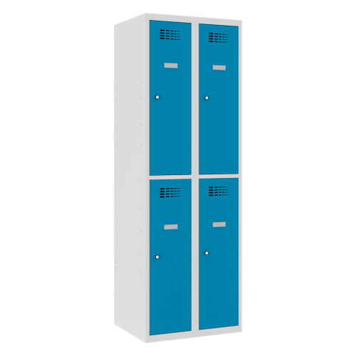 Kovový šatník šírky 600 mm s krátkymi dverami. Skriňa je uzamykateľná a dodáva sa s 2 kľúčmi pre každé dvere. Vnútorné vybavenie zahŕňa tyč s dvoma háčikmi na zavesenie oblečenia a samolepiaci držiak na menovku. Skriňa je zváraná, nie je nutná jej montáž, čo jej dodáva pevnosť a stabilitu.