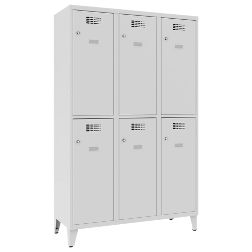 Kovový šatník šírky 1200 mm s krátkymi dverami a nohami. Skriňa je uzamykateľná a dodáva sa s 2 kľúčmi pre každé dvere. Vnútorné vybavenie zahŕňa tyč s dvoma háčikmi na zavesenie oblečenia a samolepiaci držiak na menovku. Skriňa je zváraná, nie je nutná jej montáž, čo jej dodáva pevnosť a stabilitu.