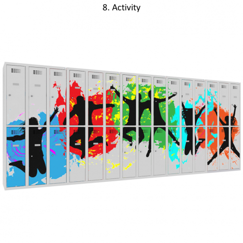 Kovový šatník, ktorý má krátke dvere s potlačou; šírka 1200 mm. Potlač je rezistentná voči UVA a UVB žiareniu a vyznačuje sa zvýšenou odolnosťou proti mechanickému poškodeniu, napr. poškriabaniu. Nami dodávaná špeciálna UV potlač je neporovnateľne odolnejšia ako fóliový polep a štyrikrát odolnejšia ako štandardná potlač. Farebná úprava povrchu je trvácna a vyznačuje sa veľmi živými farbami. Šatňové skrine s potlačou na dverách sú vhodné pre školy a organizácie, ktoré chcú neobyčajným spôsob zdieľať svoje posolstvo alebo len jednoducho oživiť svoje priestory, prípadne upútať jedinečným firemným vizuálom.