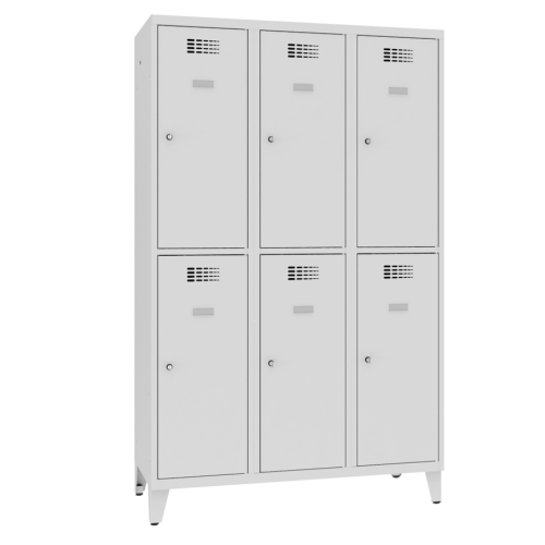 6-dverový kovový šatník na nohách s krátkymi dverami, šírky 1200 mm. Šatňová skriňa je určená predovšetkým pre školské zariadenia. V základnej cene s jednobodovým uzamykaním na kľúč (2 kľúče ku každému zámku), na vyžiadanie v tej istej cene môže byť s otočným uzáverom na visiaci zámok (visiaci zámok nie je v cene).