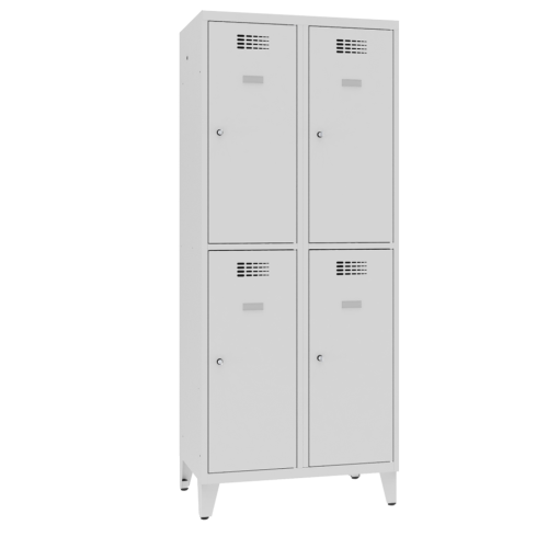4-dverový kovový šatník na nohách s krátkymi dverami, šírky 800 mm. Šatňová skriňa je určená predovšetkým pre školské zariadenia. V základnej cene s jednobodovým uzamykaním na kľúč (2 kľúče ku každému zámku), na vyžiadanie v tej istej cene môže byť s otočným uzáverom na visiaci zámok (visiaci zámok nie je v cene).