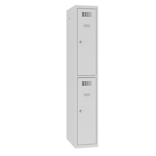 2-dverový kovový šatník s krátkymi dverami, šírky 300 mm. Šatňová skriňa je určená predovšetkým pre školské zariadenia. V základnej cene s jednobodovým uzamykaním na kľúč (2 kľúče ku každému zámku), na vyžiadanie v tej istej cene môže byť s otočným uzáverom na visiaci zámok (visiaci zámok nie je v cene).