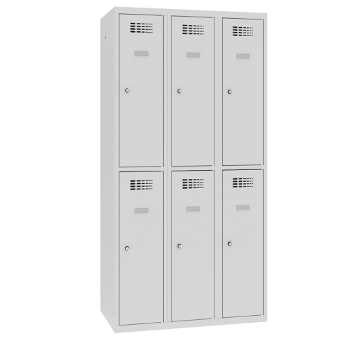 6-dverový kovový šatník s krátkymi dverami, šírky 900 mm. Šatňová skriňa je určená predovšetkým pre školské zariadenia. V základnej cene s jednobodovým uzamykaním na kľúč (2 kľúče ku každému zámku), na vyžiadanie v tej istej cene môže byť s otočným uzáverom na visiaci zámok (visiaci zámok nie je v cene).