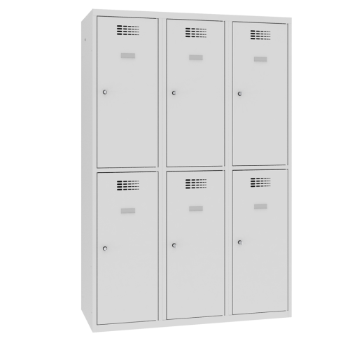 6-dverový kovový šatník s krátkymi dverami, šírky 1200 mm. Šatňová skriňa je určená predovšetkým pre školské zariadenia. V základnej cene s jednobodovým uzamykaním na kľúč (2 kľúče ku každému zámku), na vyžiadanie v tej istej cene môže byť s otočným uzáverom na visiaci zámok (visiaci zámok nie je v cene).