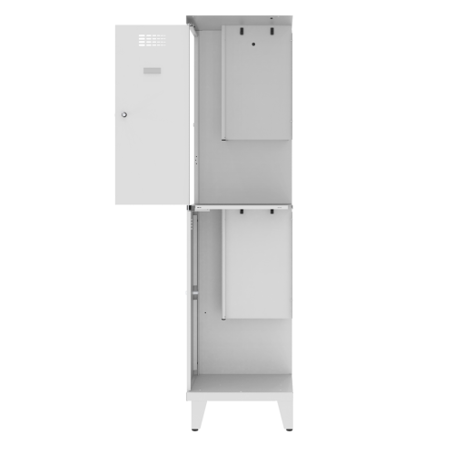 Vnútorné usporiadanie šatníka ako na obrázku: úložné oddelenia na knihy, desiatu atď. Oblečenie je možné zavesiť na 2 plastové háky vo vnútri oddelenia. Okrem vetrákov sú dvere vybavené samolepiacou menovkou. Otváranie dverí je limitované na 90°, to umožňuje pohodlný prístup aj pri viacerých otvorených dverách súčasne, napr. počas prestávky.