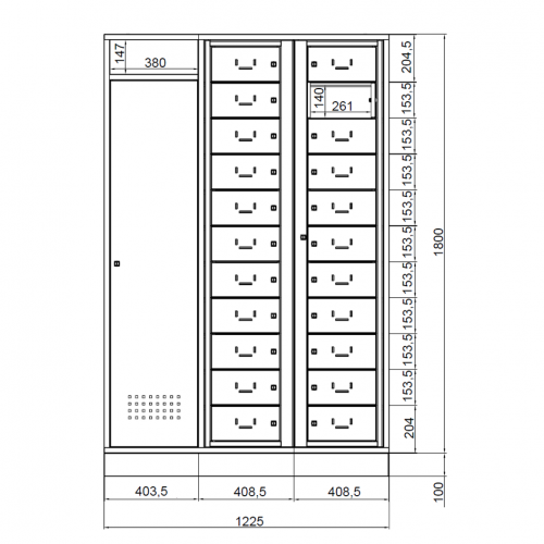 Kovová skriňa, ktorá je svojou funkčnosťou určená predovšetkým na výdaj a zber pracovného oblečenia. Samostatne uzamykateľné oddelenia umožňujú otvárať každé oddelenie zvlášť (pre zamestnancov). Za účelom zásobovania je možné otvoriť všetky oddelenia naraz vďaka špeciálnej konštrukcii a jednoducho ich doplniť (pre zásobovača). Skriňa disponuje aj otvorom na vhodenie použitého oblečenia. Skriňa obsahuje 22 výdajných oddelení a 1 oddelenie pre zber oblečenia.