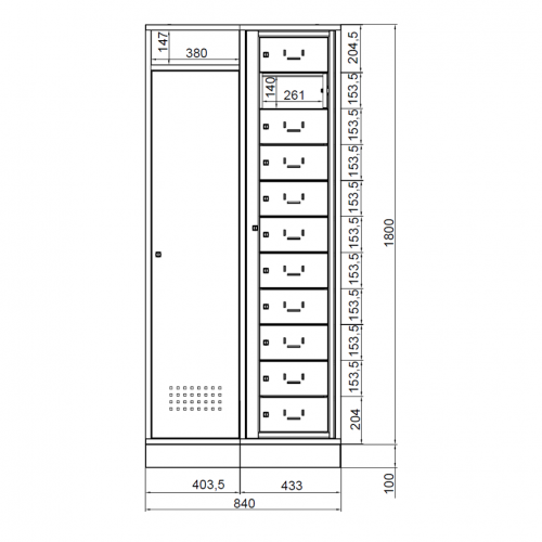 Kovová skriňa, ktorá je svojou funkčnosťou určená predovšetkým na výdaj a zber pracovného oblečenia. Samostatne uzamykateľné oddelenia umožňujú otvárať každé oddelenie zvlášť (pre zamestnancov). Za účelom zásobovania je možné otvoriť všetky oddelenia naraz vďaka špeciálnej konštrukcii a jednoducho ich doplniť (pre zásobovača). Skriňa disponuje aj otvorom na vhodenie použitého oblečenia. Skriňa obsahuje 11 výdajných oddelení a 1 oddelenie pre zber oblečenia.