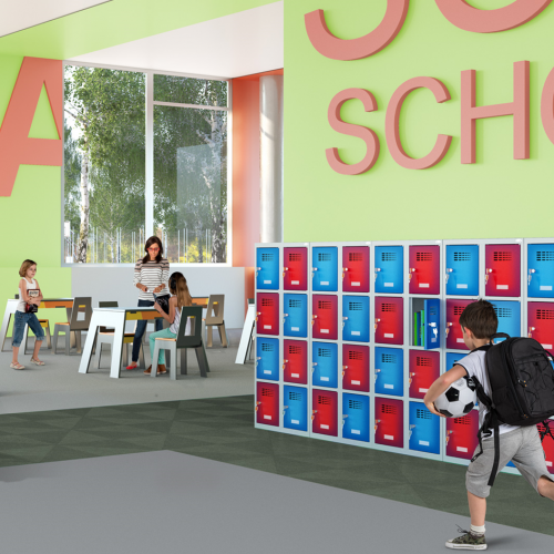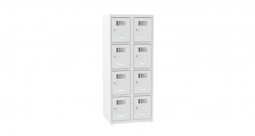 Nízka kovová šatňová skriňa s priehradkami. Vhodná pre predškolákov vďaka zníženej konštrukcii.