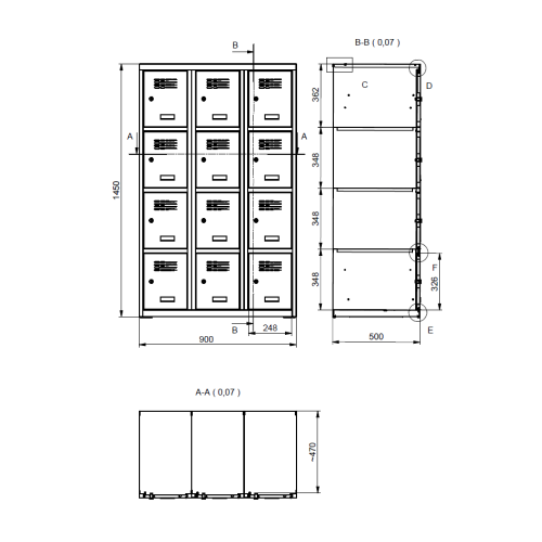 Nízka kovová šatňová skriňa s priehradkami. Vhodná pre predškolákov vďaka zníženej konštrukcii.