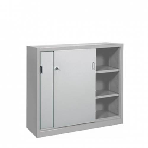 Skriňa s posuvnými dverami šírky 1000 mm. Pri použití týchto skríň nie je nutné disponovať priestorom pre otváranie dverí tak, ako je to napríklad pri skriniach s krídlovými dverami. Posuvné kovové dvere udržia vaše dokumenty v bezpečí. Spoľahlivý mechanizmus posuvu dverí je uzamykateľný cylindrickým zámkom. Police sú nastaviteľné po 25 mm po celej výške skrine.