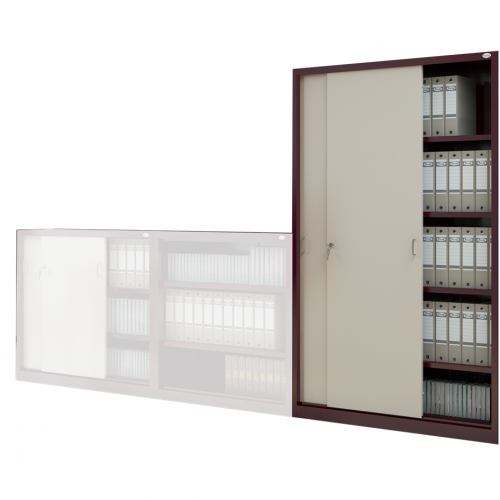 Kovová skriňa s posuvnými dverami šírky 1000 mm. Pri použití týchto skríň nie je nutné disponovať priestorom pre otváranie dverí tak, ako je to napríklad pri skriniach s krídlovými dverami. Posuvné kovové dvere udržia vaše dokumenty v bezpečí. Spoľahlivý mechanizmus posuvu dverí je uzamykateľný cylindrickým zámkom. Police sú nastaviteľné po 25 mm po celej výške skrine.
