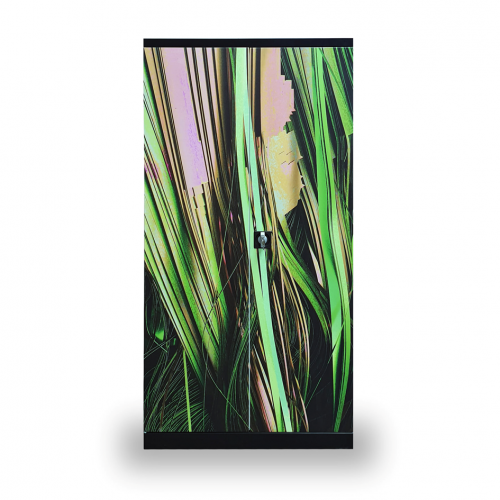 Uzamykateľná policová skriňa s otočnými dverami. Dvere skrine sú potlačené motívom. Potlač je rezistentná voči UVA a UVB žiareniu a vyznačuje sa zvýšenou odolnosťou proti mechanickému poškodeniu, napr. poškriabaniu. Nami dodávaná špeciálna UV potlač je neporovnateľne odolnejšia ako fóliový polep a štyrikrát odolnejšia ako štandardná potlač. Farebná úprava povrchu je trvácna a vyznačuje sa veľmi živými farbami. Skrine s potlačou na dverách sú vhodné pre školy a organizácie, ktoré chcú neobyčajným spôsob zdieľať svoje posolstvo alebo len jednoducho oživiť svoje priestory, prípadne upútať jedinečným firemným vizuálom.