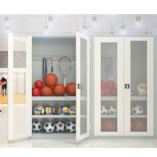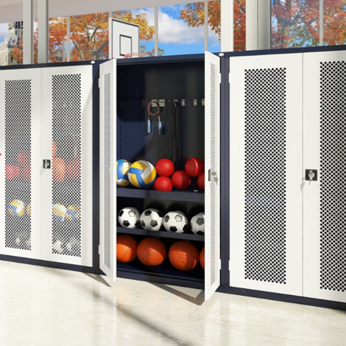 Kovová skriňa určená na úschovu športových potrieb. Uzamykateľné perforované dvere s dvoma kľúčmi. Možné skladovať, napr.: lopty, švihadlá, ale aj potreby ako stopky, píšťala a pod. Vnútorná dispozícia je vo veľkej miere prispôsobiteľná zákazníkovi. Svetlošedé prevedenie je zvyčajne skladom.