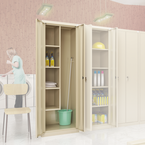 Uzamykateľná skriňa s dvoma kľúčmi, vhodná na čistiace potreby. Dispozičné riešenie skrine navrhnuté pre skladovanie čistiacich prostriedkov, kýbla, mopu, metly a podobne.