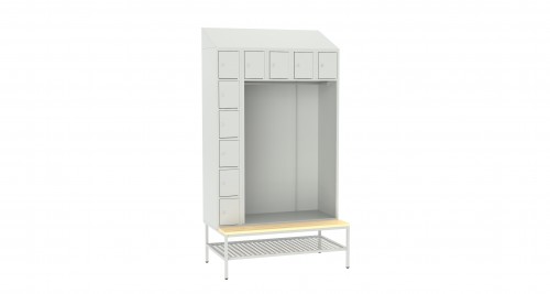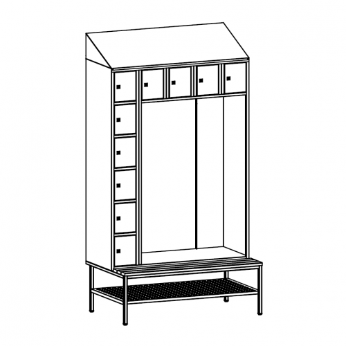 Otvorená šatňová skriňa s lavičkou s drevenými doskami a 10 priehradkami. V hornej časti skrine je polica na odkladanie vecí. Pod policou je tyč na vešiaky. Pod lavičkou sa nachádza rošt na topánky. Celková hĺbka skrine vrátane lavičky je 745 mm.
