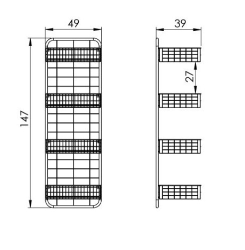 Závesný stojan na stenu s košíkmi z AISI304 nehrdzavejúcej ocele. Balenie obsahuje aj spojovací materiál na uchytenie na stenu. Stojan je vybavený: