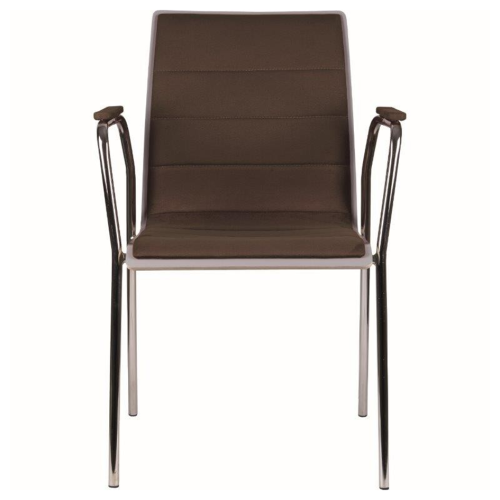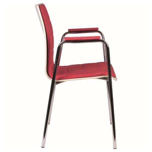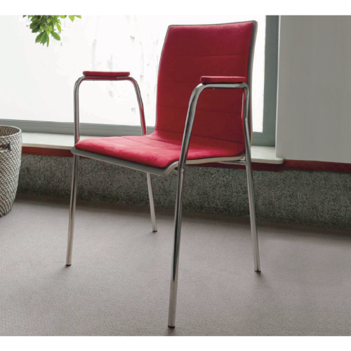 Exkluzívna čalúnená stolička s chrómovanou konštrukciou. Opierky a podrúčky sú drevené. Možnosť dodať aj s čalúnenými opierkami rúk. Farba čalúnenia a farba dreva je voliteľná, viď. obrázky produktu. Výška x šírka x hĺbka sedadla: 470 x 440 x 400 mm. Stoličky sú stohovateľné po 6 ks.