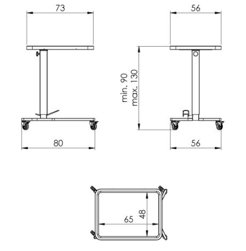 Stolík na inštrumenty z AISI304 nehrdzavejúcej ocele. Vnútorné rozmery plochy stola sú 650 x 480 mm, s jemným prelisom a nosnosťou 30 kg. Plát stola je otočný o 360°, s možnosťou aretácie, odnímateľný a prenosný. Dezinfekcia je možná 130°C parou za dobu 3 minút. Vozík sa dodáva v antistatickom prevedení. Výška je nastaviteľná hydraulickým piestom, ktorý je zabezpečený proti úniku kvapalín. Výška plochy stola je nastaviteľná v rozmedzí 900 - 1300 mm. Stolík je vybavený 4 x plastovým kolieskom priemeru 75 mm s brzdou.