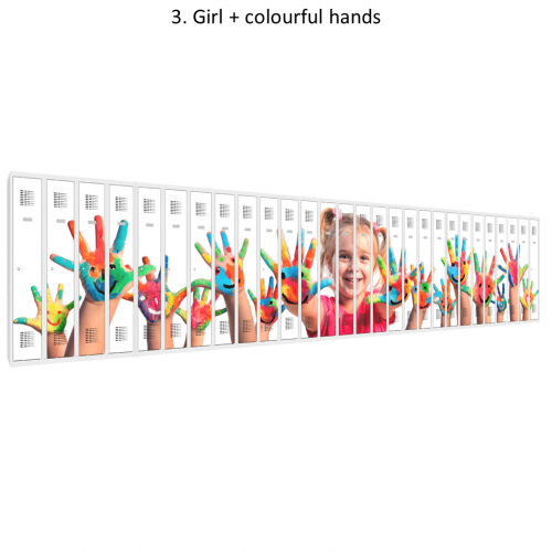 Kovový šatník, ktorý má krátke dvere s potlačou; šírka 600 mm. Potlač je rezistentná voči UVA a UVB žiareniu a vyznačuje sa zvýšenou odolnosťou proti mechanickému poškodeniu, napr. poškriabaniu. Nami dodávaná špeciálna UV potlač je neporovnateľne odolnejšia ako fóliový polep a štyrikrát odolnejšia ako štandardná potlač. Farebná úprava povrchu je trvácna a vyznačuje sa veľmi živými farbami. Šatňové skrine s potlačou na dverách sú vhodné pre školy a organizácie, ktoré chcú neobyčajným spôsob zdieľať svoje posolstvo alebo len jednoducho oživiť svoje priestory, prípadne upútať jedinečným firemným vizuálom.