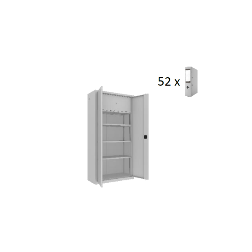 Univerzálna skriňa, 1990 x 1000 x 435 mm, s otočnými dverami a bezpečnostnou schránkou vo vnútri skrine. Dodávaná s 2 kľúčmi a 3 policami, ktoré sú prestaviteľné po 25 mm. Skriňa je zváraná, nie je nutná jej montáž, čo jej dodáva pevnosť a stabilitu. V základnej výbave sú aj nastaviteľné nožičky, ktoré umožnia nastavenie skrine do vodorovnej polohy.