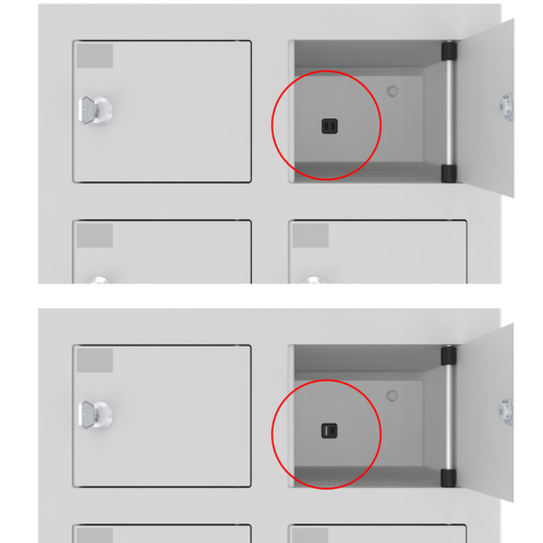 Skriňa s úschovnými priehradkami na nabíjanie mobilov. Detailný popis