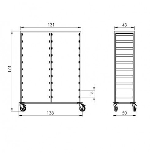 Vozík z nehrdzavejúcej ocele AISI304 a vysúvateľnými plastovými košíkmi. ISO košíky sú dostupné v troch veľkostiach: S, M, L a ich vnútro je možné predelovať priečkami. V cene produktu nie sú zahrnuté plastové košíky - tie je nutné zakúpiť zvlášť. Vozík je vybavený madlom, plastovými nárazníkmi a kolieskami priemeru 125 mm s brzdou.
