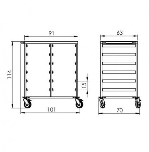 Vozík z nehrdzavejúcej ocele AISI304 a vysúvateľnými plastovými košíkmi. ISO košíky sú dostupné v troch veľkostiach: S, M, L a ich vnútro je možné predelovať priečkami. V cene produktu nie sú zahrnuté plastové košíky - tie je nutné zakúpiť zvlášť. Vozík je vybavený madlom, plastovými nárazníkmi a kolieskami priemeru 125 mm s brzdou.