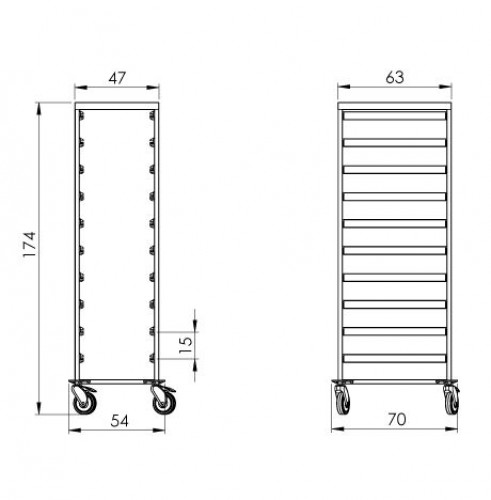 Vozík z nehrdzavejúcej ocele AISI304 a vysúvateľnými plastovými košíkmi. ISO košíky sú dostupné v troch veľkostiach: S, M, L a ich vnútro je možné predelovať priečkami. V cene produktu nie sú zahrnuté plastové košíky - tie je nutné zakúpiť zvlášť. Vozík je vybavený madlom, plastovými nárazníkmi a kolieskami priemeru 125 mm s brzdou.