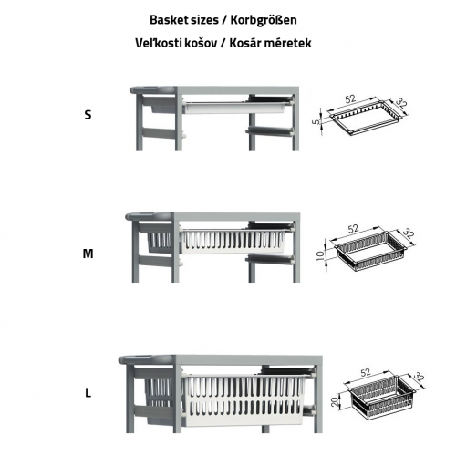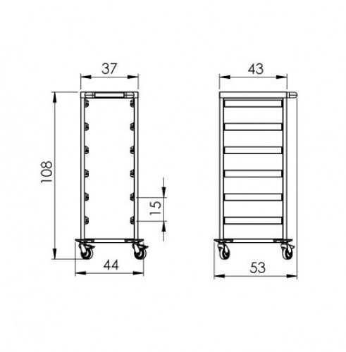 Vozík z nehrdzavejúcej ocele AISI304 a vysúvateľnými plastovými košíkmi. ISO košíky sú dostupné v troch veľkostiach: S, M, L a ich vnútro je možné predelovať priečkami. V cene produktu nie sú zahrnuté plastové košíky - tie je nutné zakúpiť zvlášť. Vozík je vybavený madlom, plastovými nárazníkmi a kolieskami priemeru 75 mm s brzdou.