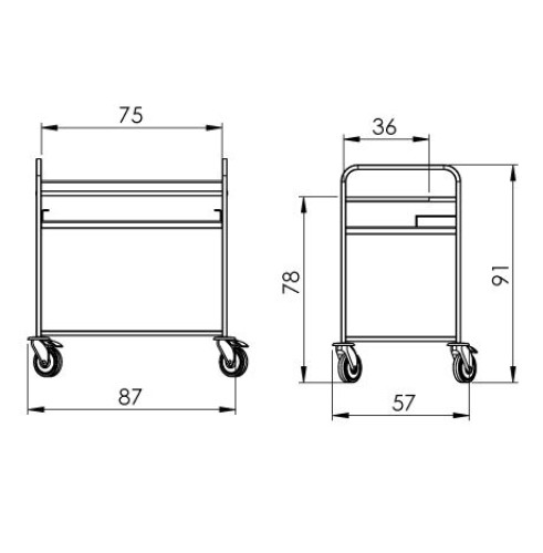 Transportný vozík z nehrdzavejúcej ocele AISI304. Horná plocha stolíka má nosnosť 70 kg. Veľká odkvapová vaňa je uchytená napevno, objem vane je 10 l a nosnosť 15 kg. Malá odkvapová vaňa je odnímateľná, jej objem je 3,5 l. Celková nosnosť vozíka je 80 kg. Kolesá sú plastové a sú vybavené nárazníkmi. Priemer kolies je 125 mm, z toho 2 sú brzdené.