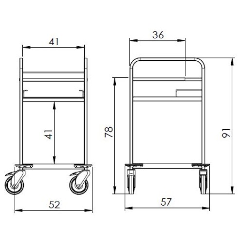 Transportný vozík z nehrdzavejúcej ocele AISI304. Horná plocha stolíka má nosnosť 40 kg a spodná plocha 30 kg. Veľká odkvapová vaňa je uchytená napevno, objem vane je 5,5 l a nosnosť 10 kg. Malá odkvapová vaňa je odnímateľná, jej objem je 1,8 l. Celková nosnosť vozíka je 50 kg. Kolesá sú plastové a sú vybavené nárazníkmi. Priemer kolies je 125 mm, z toho 2 sú brzdené.