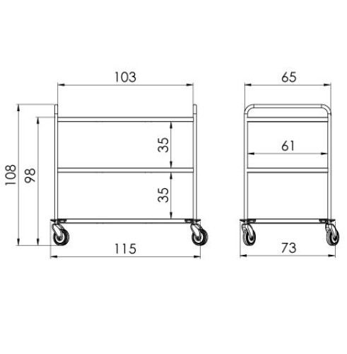 Transportný vozík z nehrdzavejúcej ocele AISI304. Úložné plochy stolíka sú vo vyhotovení s 12 mm prelisom, nosnosťou 100 kg a antirezonančnou výstuhou. Celková nosnosť vozíka je 300 kg. Kolesá sú plastové, s mäkčeným behúňom, ktorý nezanecháva stopy a sú vybavené nárazníkmi. Priemer kolies je 125 mm, z toho 2 sú brzdené.