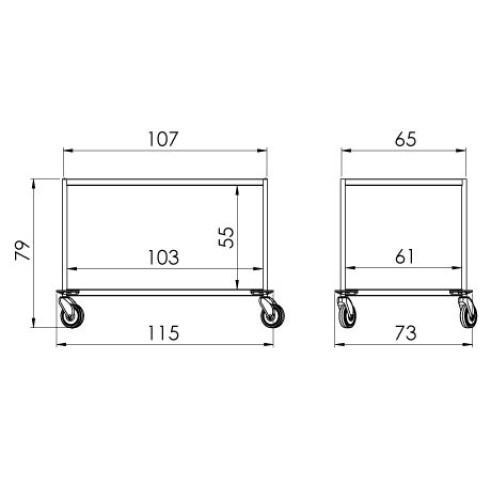 Transportný vozík z nehrdzavejúcej ocele AISI304. Úložné plochy stolíka sú vo vyhotovení s 12 mm prelisom, nosnosťou 100 kg a antirezonančnou výstuhou. Celková nosnosť vozíka je 200 kg. Kolesá sú plastové, s mäkčeným behúňom, ktorý nezanecháva stopy a sú vybavené nárazníkmi. Priemer kolies je 125 mm, z toho 2 sú brzdené.