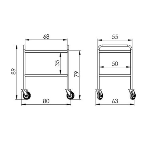 Transportný vozík z nehrdzavejúcej ocele AISI304. Úložné plochy stolíka sú vo vyhotovení s 12 mm prelisom, nosnosťou 50 kg a antirezonančnou výstuhou. Celková nosnosť vozíka je 100 kg. Kolesá sú plastové, s mäkčeným behúňom, ktorý nezanecháva stopy a sú vybavené nárazníkmi. Priemer kolies je 125 mm, z toho 2 sú brzdené.